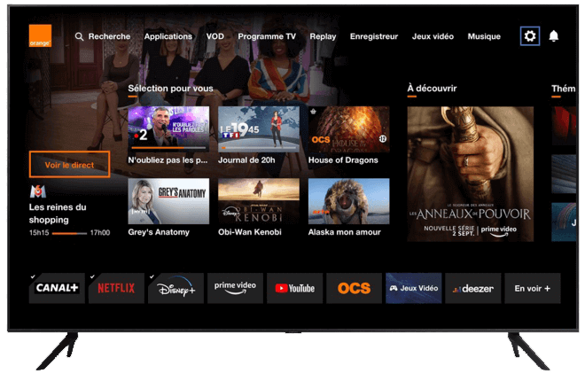 Accédez à tout ce que vous aimez : Netflix, Disney+, Prime Vidéo, OCS, Canal, beIN SPORTS, Vidéo à la Demande, Replay, jeux vidéo, radio, Deezer, YouTube... Profitez aussi du moteur de recherche de la TV d'Orange pour trouver facilement vos programmes sans passer d'une appli à l'autre.